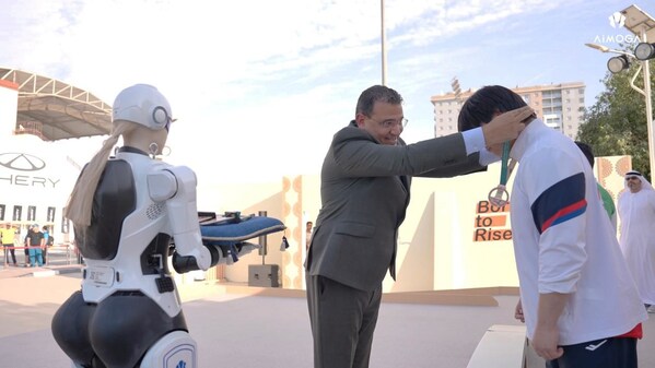 阿联酋迪拜2025年12月14日 美通社 -- 迪拜当地时间1212,2025亚洲青年残运会(AYPG)举行了举重项目的颁奖仪式。在这场奖牌仪式上,聚光灯不仅照亮了领奖台上的青年运动员,也照亮了两位“新上岗”的赛场伙伴:墨甲机器人墨茵(Mornine与机器狗Argos他们共同协助亚洲残奥委员会首席执行官为举重冠军颁发金牌,这是机器人在体育赛场的创新应用,为赛场带来一次科技感十足的颁奖仪式。