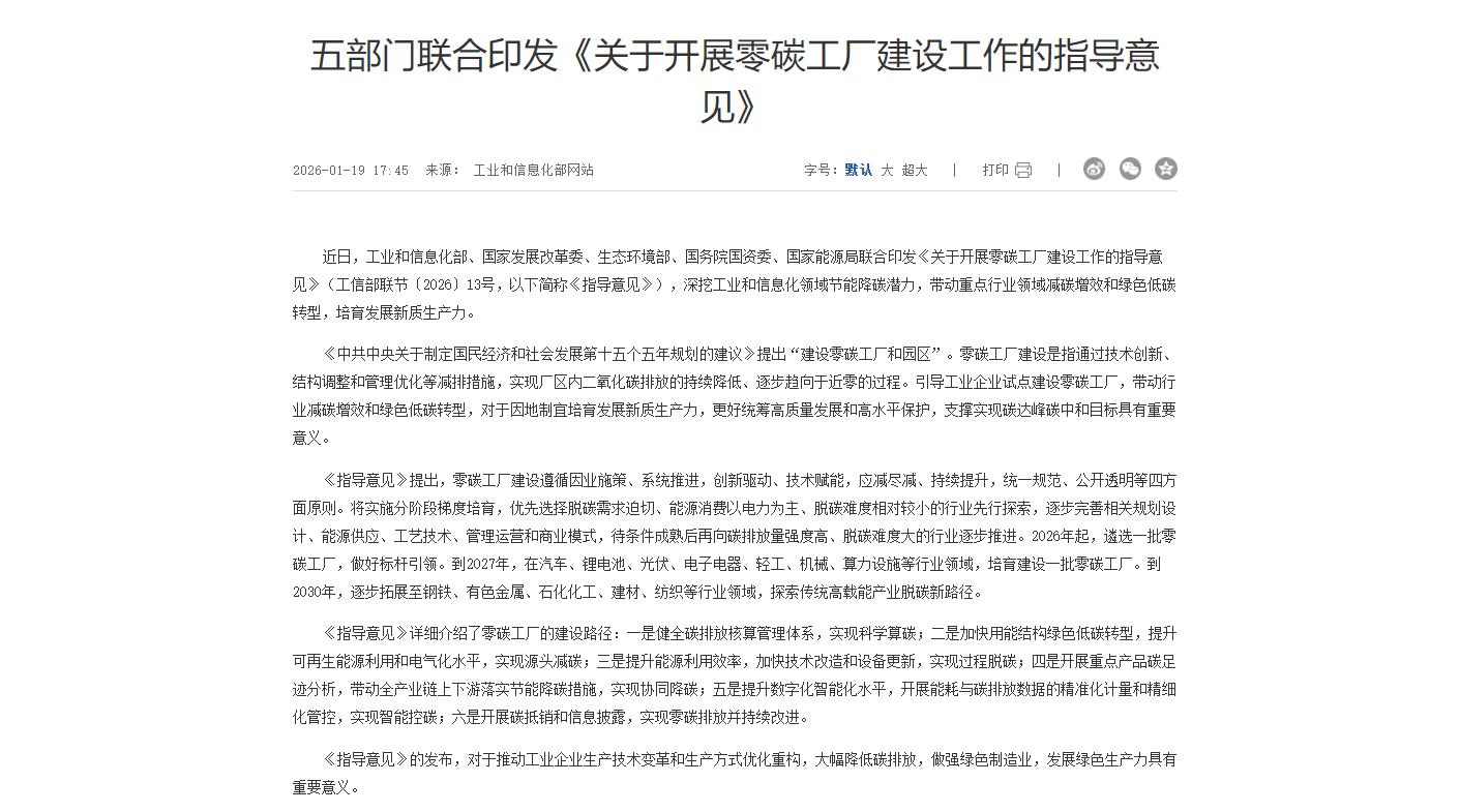 近日,工业和信息化部、国家发展改革委、生态环境部、国务院国资委、国家能源局联合印发《关于开展零碳工厂建设工作的指导意见》,提出“建设零碳工厂和园区”。2026年起,遴选一批零碳工厂,做好标杆引领。到2027年,在汽车、锂电池、光伏、电子电器、轻工、机械、算力设施等行业领域,培育建设一批零碳工厂。到2030年,逐步拓展至钢铁、有色金属、石化化工、建材、纺织等行业领域,探索传统高载能产业脱碳新路径。