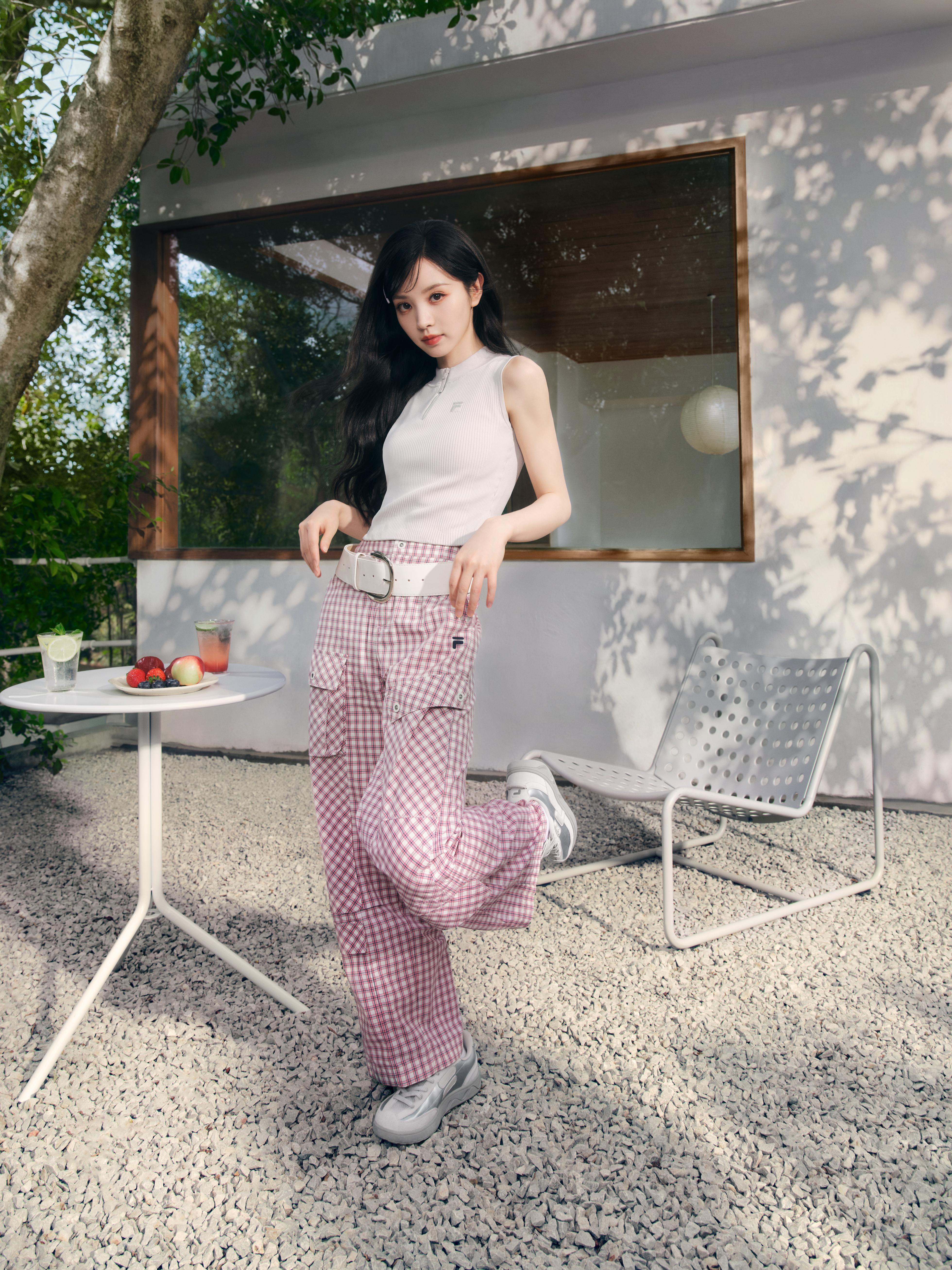 FILA FUSION潮流代言人田曦薇的造型精准捕捉了“甜酷风”的精髓。上身燕麦灰紧身编织背心,半拉链立领与修身剪裁,巧妙勾勒出身形线条,展现内敛的活力。下身搭配的全新WORKWEAR“女团裤”是整个造型的点睛之笔,整体采用经典的直筒廓形,有效拉长腿部的线条比例;配色上,品牌并未拘泥于格纹的复古语境,而是采用了独特的帕斯蒂尔低饱和粉色,显年轻且极具活力,低明度特性甚至提亮肤色,对男女穿着者皆极具包容性,让经典格纹焕发出属于Z世代的清新气息。侧边的多口袋模块化设计,在强化工装造型感的同时,亦能起到修饰腿型的效果。脚上的浅灰色BOBO BLING学院薄底鞋则以学院风造型点缀整体视觉,PIUMAX科技更能加持舒适脚感,随着音乐节的狂欢开启,即可以天生出「格」之姿,点亮全场。