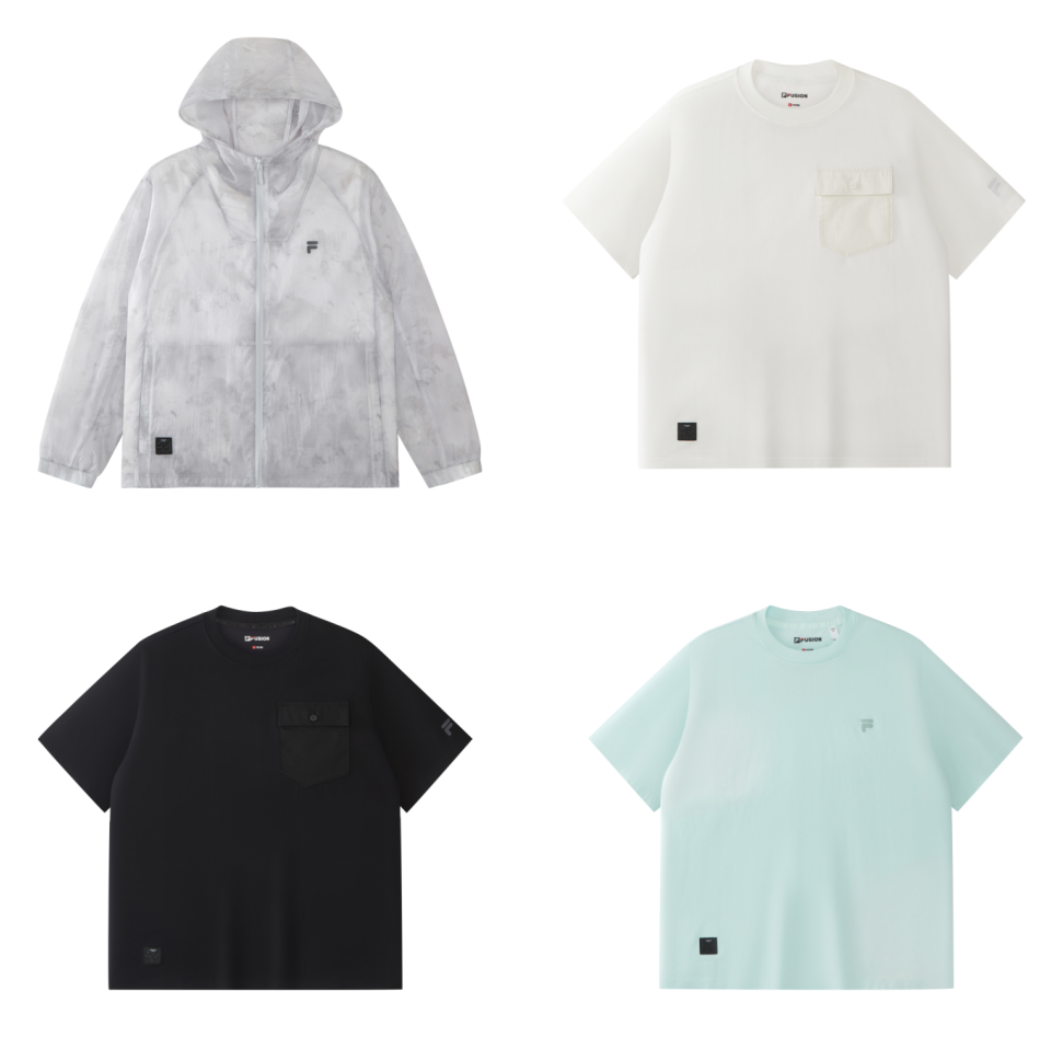 男士系列侧重功能与风格的融合。一件橄榄灰调的斑驳印花防晒皮肤衣,以做旧质感与宽松连帽设计定下复古基调,后背透气活页提升舒适度。内搭选择上,口袋短袖T恤以利落正肩剪裁和斜裁口袋展现结构巧思;图案短袖T恤则以宽松廓形与小Logo印花塑造百搭基底,二者均采用COOLMAX凉感面料。完整构筑了一个充满可能性的“出格”衣橱。