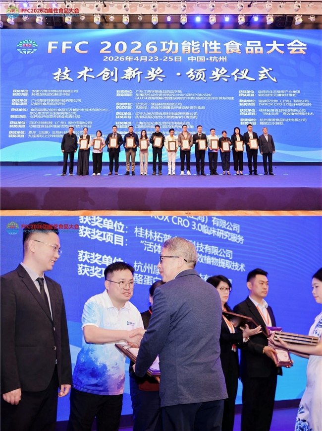 会上,百环生物科技(广州)股份有限公司凭借“功能性食品多维度功效评价技术平台”的突破性成果,斩获FFC2026功能性食品大会技术创新奖。经大会组委会专家组严格评审,该平台在评价维度的全面性、技术方法的创新性与行业应用的示范性上表现突出,为功能性食品行业的功效评价提供了科学、高效的解决方案,也彰显了百环生物在功效评价领域的技术实力与行业引领地位。