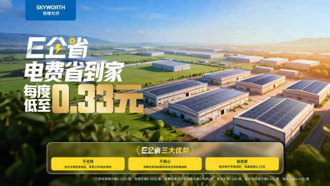 面向工业园区、物流仓储等大型用电场景,创维光伏超级物种·能亮站——「E企省」,通过能源管理合同模式,由创维全额投资建设并运维电站,业主低成本投入,即可享用25年低于工商业电价的绿色电力,每度电低至0.33元。