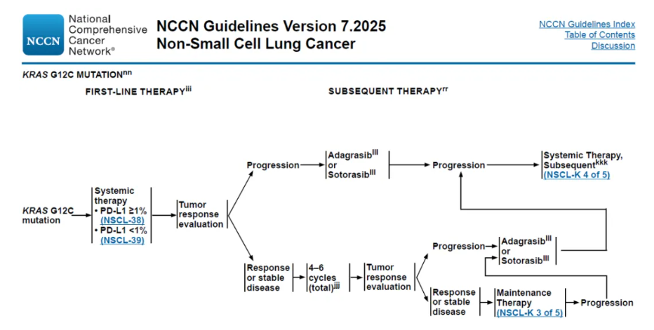 长期以来,KRAS突变NSCLC患者的治疗手段较为匮乏。根据2025 NCCN指南,KRAS G12C突变一线治疗主要参考驱动基因阴性方案(化疗±免疫为主,PD-L1高表达可采用免疫单药),二线及以上治疗则推荐KRAS G12C抑制剂(Adagrasib或Sotorasib),然而疾病进展后治疗选择有限;而对于更广泛的非G12C突变人群,目尚无针对性的治疗方案。