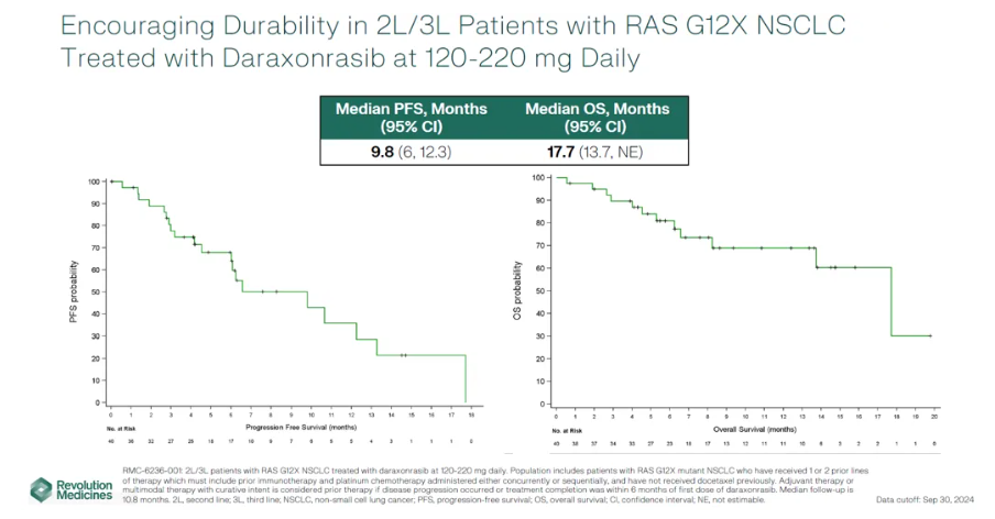 当前,二线及以上KRAS突变NSCLC治疗仍以多西他赛治疗为主,但其ORR通常不足13%4。而在同一领域的在研产品中,Revolution Medicines开发的RAS(ON)抑制剂RMC-6236凭借优异的疗效数据备受关注,其1期临床研究显示:RMC-6236治疗二/三线RAS G12X突变NSCLC患者ORR为38%,mPFS为9.8个月,mOS为17.7个月。