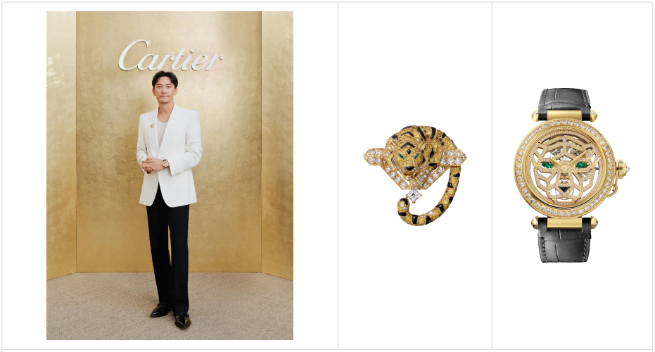 佩戴卡地亚高级珠宝系列TIGRE胸针、PASHA DE CARTIER猎豹装饰镂空腕表