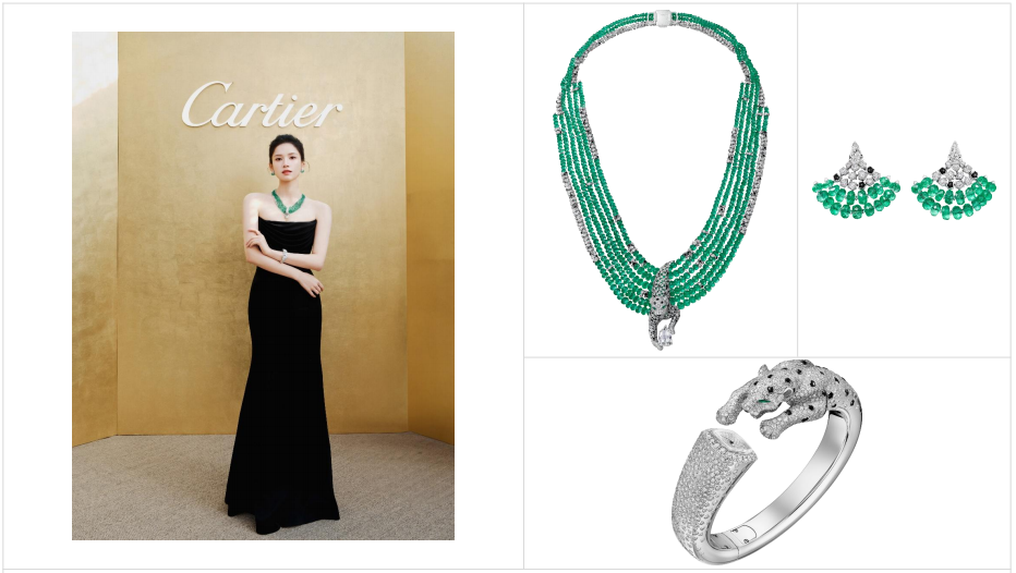 佩戴卡地亚EN ÉQUILIBRE高级珠宝系列PANTHÈRE DENTELÉE项链及耳环、猎豹造型高级珠宝腕表