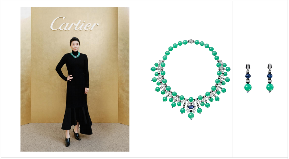 佩戴卡地亚EN ÉQUILIBRE高级珠宝系列SEAFOAM GREEN CHAMANE项链及耳环