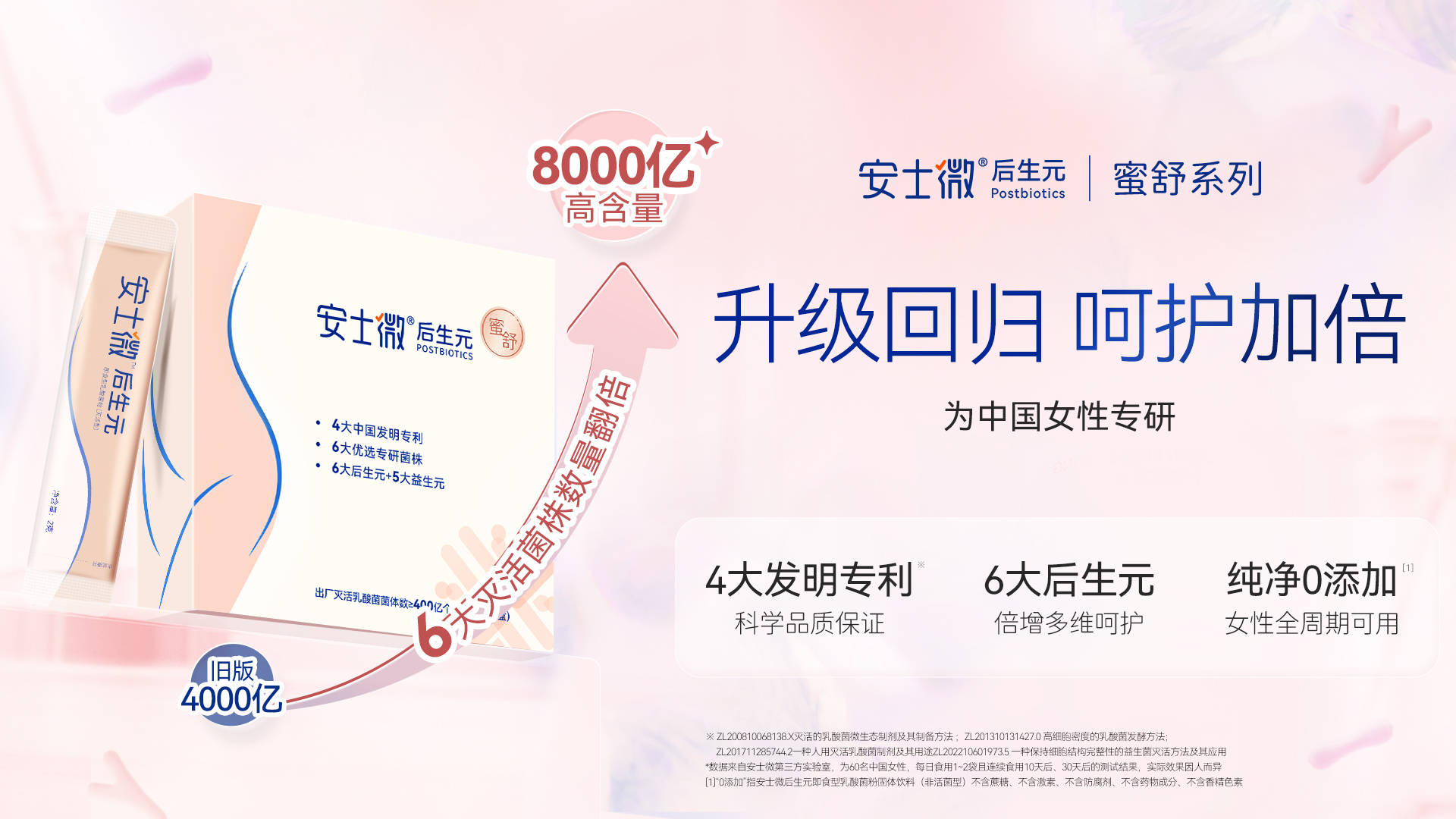 当代女性对健康的需求愈发多元细分,从私密舒适、皮肤透亮到母婴安康、口腔清新,同时渴望用简单便捷的方式实现全维养护。安士微后生元蜜舒系列自上市以来,凭借品质与功效圈粉无数,用户好评不断:“皮肤水润透亮了”“私密不适彻底改善”“备孕吃着放心”。这份认可成为品牌精进的动力,为回应女性对全维度健康的更高需求,安士微后生元蜜舒系列全新升级,以“灭活菌菌体数翻倍 + 6大专利菌株升级 + 5大益生元成分提质”的三重硬实力,解锁从内到外的全维健康解决方案。