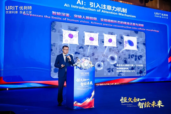 优利特国内市场部产品经理石强先生以《智检细胞,慧诊血液》为题,系统展示了人工智能在血球复检与细胞形态学分析中的前沿实践,构建从“精密成型”到“智慧洞察”的一体化解决方案,推动血常规检测从人工镜检向数智化闭环跃迁。这不仅实现了设备层面的升级,更重塑了复检流程,让每一份血检标本都能获得“专家级”的智慧诊断。