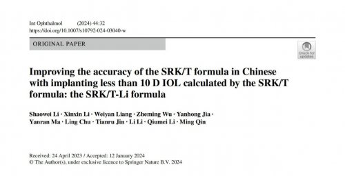 [4] Shaowei Li,Xinxin Li,Weiyan Liang, et al. Improving the accuracy of the SRK/T formula in Chinese with implanting less than 10 D IOL calculated by the SRK/T formula: the SRK/T-Li formula[J]. International Ophthalmology,2024,in press.