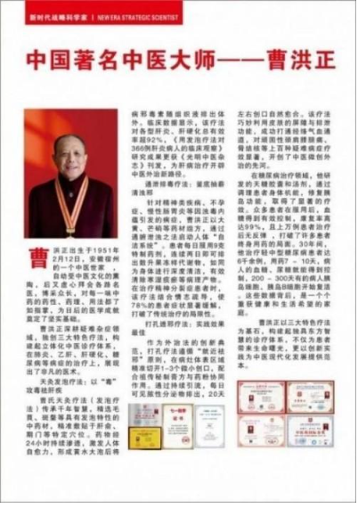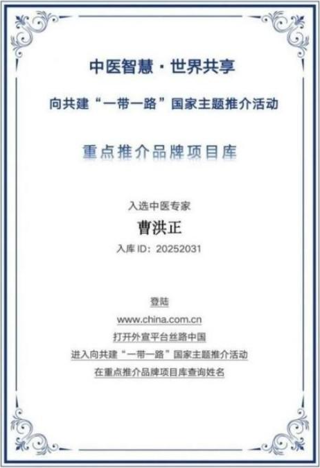 在医学的征程上, 曹洪正医师始终以坚定的步伐和执着的信念,深耕于医学领域,不断探索着中医的奥妙与智慧。他不仅是医学领域的领航者,更是中医文化的传承者与弘扬者。他的每一次努力,都为中医文化的国际化发展贡献着重要力量。未来,我们期待曹洪正医师能够继续乘持初心,以精湛的医术和深厚的中医底蕴,为更多人带去健康与希望,不断书写出中医文化的新篇章,让中医的智慧之光照亮世界的每一个角落。
