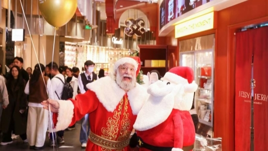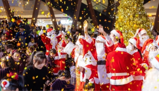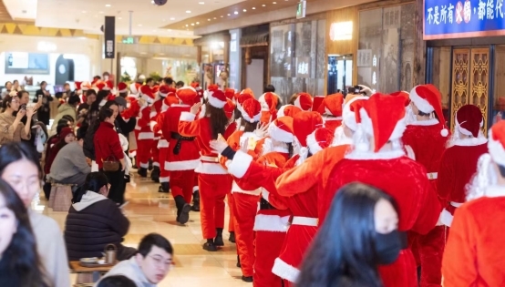节日的气氛,往往是从第一眼惊喜开始的。12月24日下午14:00,伴随着一阵欢快的铃声,由50位圣诞老人组成的“超大天团”仿佛从童话书中集体出逃,他们身背礼物袋,迈着欢快的步伐,在人群中穿梭互动。