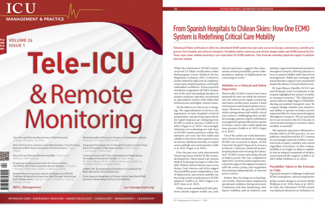 国际重症医学领域专业期刊《ICU Management & Practice》于3月10日发布《From Spanish Hospitals to Chilean Skies: How One ECMO System Is Redefining Critical Care Mobility》(从西班牙医院到智利天空:一套体外膜肺氧合系统如何重新定义重症监护机动性),刊登了汉诺Lifemotion® ECMO系统的国际临床应用经验。这份面向全球约3万至4万名重症医疗专业人士的权威读物,用详实的跨国临床实践案例,向世界展示了中国高端医疗装备在极限环境下的稳定表现。